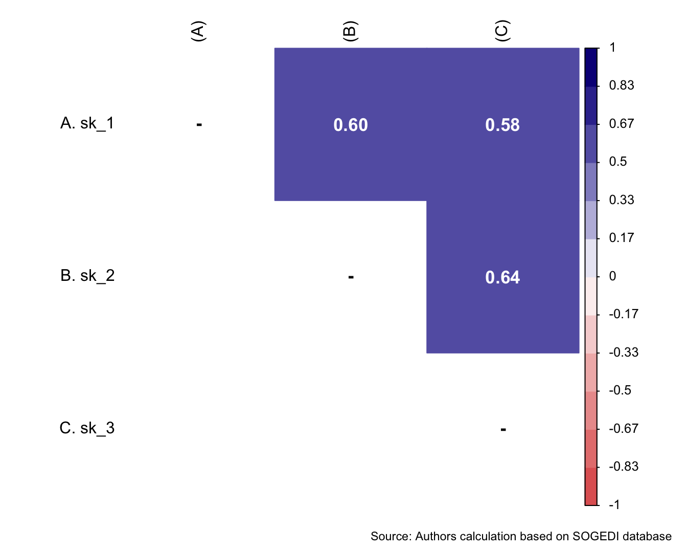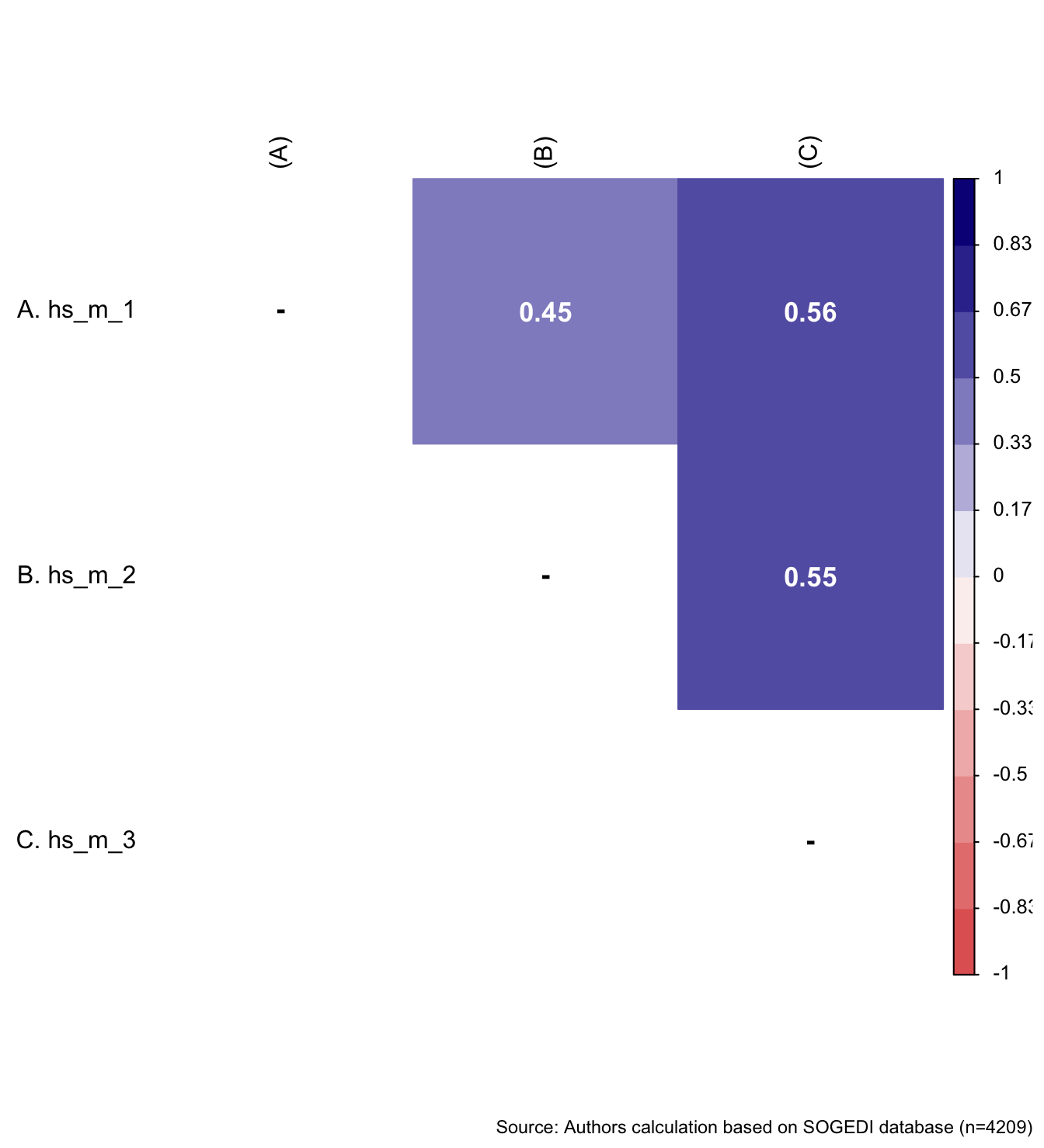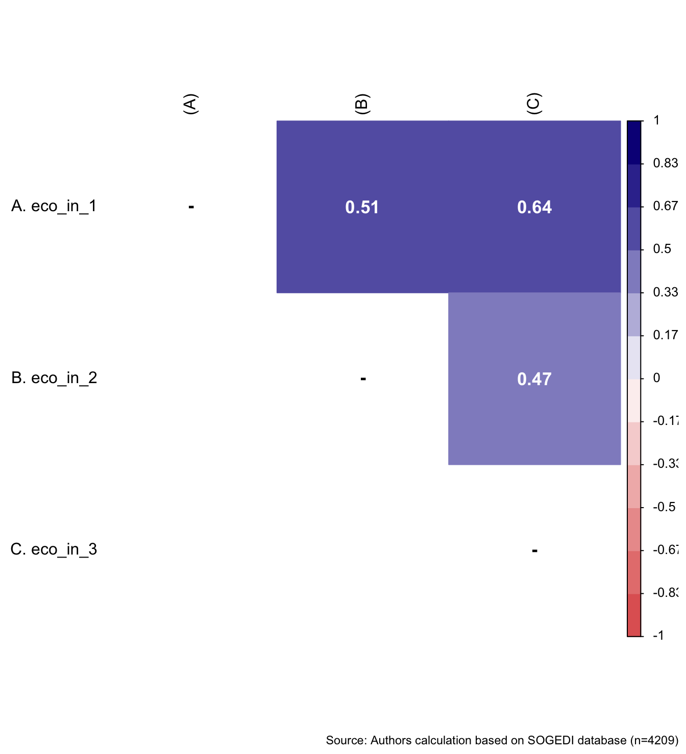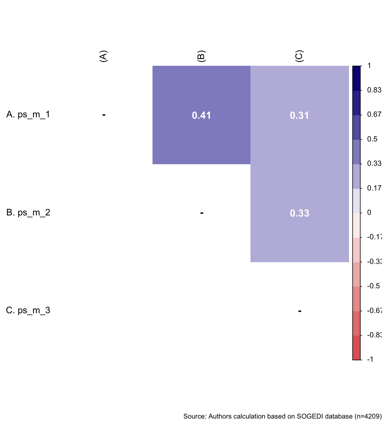 A descriptive analysis is conducted for all survey items, covering both single variables and those that form part of composite indicators or latent factors. For the latter, correlation matrices and reliability indices (Cronbach’s alpha) are also computed. In several instances, we evaluate factorial structures on the basis of the original sources and the publications from which the items were adapted, while remaining open to alternative configurations during the data exploration phase.